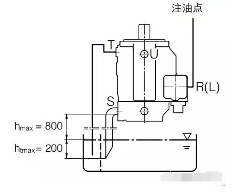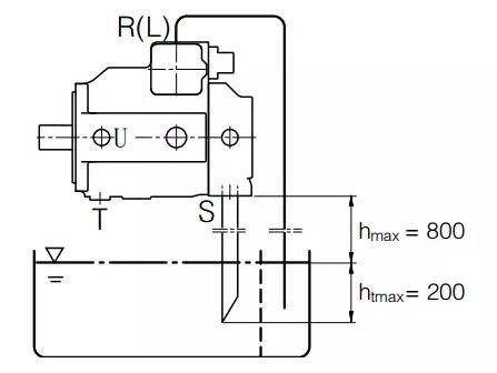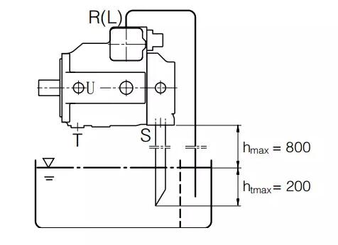 當最低油位低于泵的上邊緣時:必須對殼體泄油口和油口 S進行管路連接,請參見下圖。 請遵守上文中所述條件。在調(diào)試前向泵殼體注油。