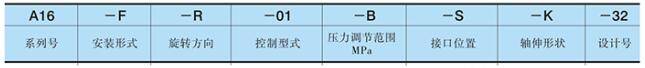 系列號:圖示“A16”表示為該系列油泵的系列號(A系列油泵具有多個系列號對應(yīng)不同幾何排量及工作壓力,見下表)